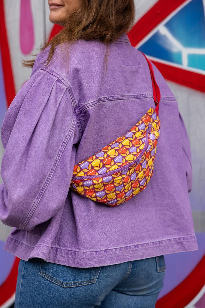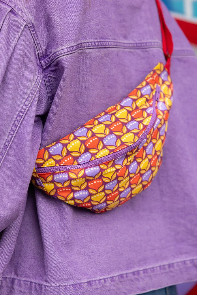 La banane imprimée Tulipop est une banane femme fait main, cousue dans mon atelier en Bretagne, en tissu fleuri rétro aux tons violet, moutarde et rouge
