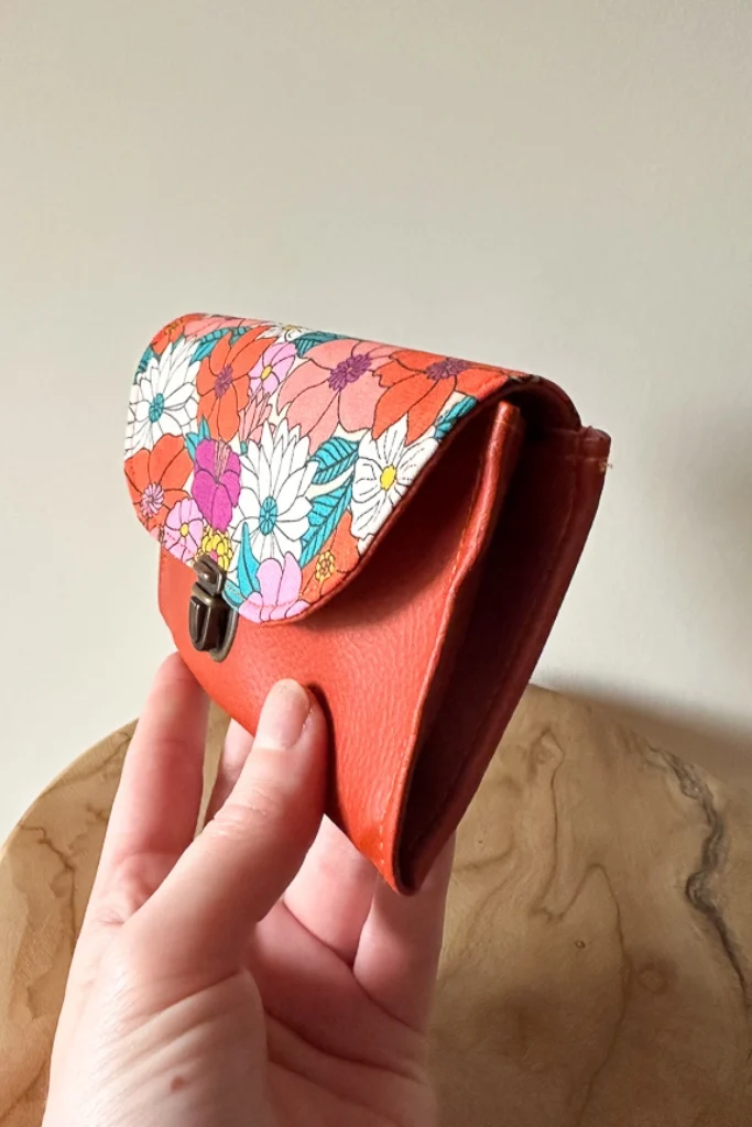 Porte monnaie femme fait main Luz – simili cuir rouille et tissu fleuri coloré