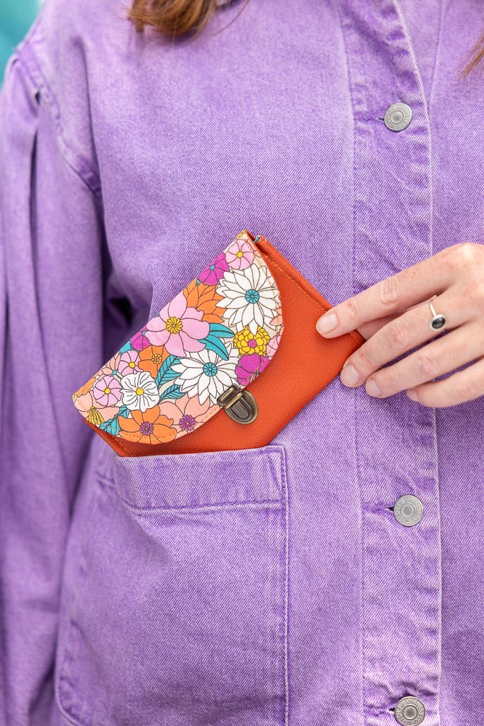 Portefeuille femme fait main Luz – simili cuir rouille et tissu fleuri coloré