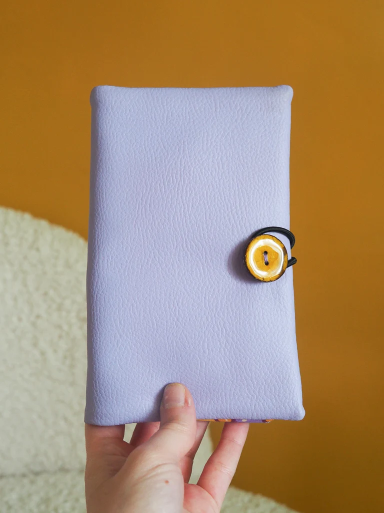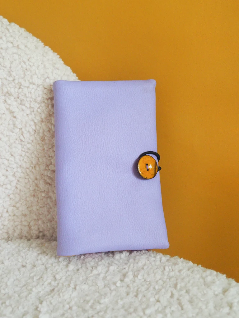 Le portefeuille Tulipop mauve est cousu main dans mon atelier en Bretagne.