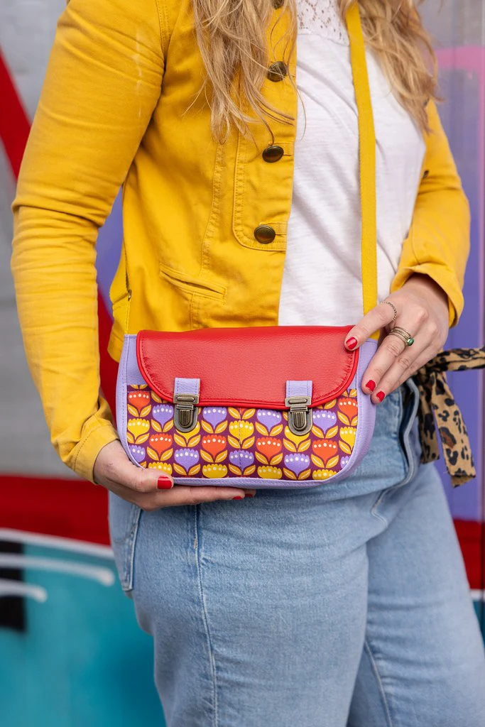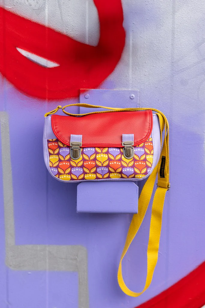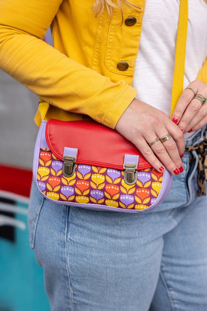 Sac besace Tulipop – sac bandoulière femme fait main coloré en simili cuir rouge et tissu fleuri rétro